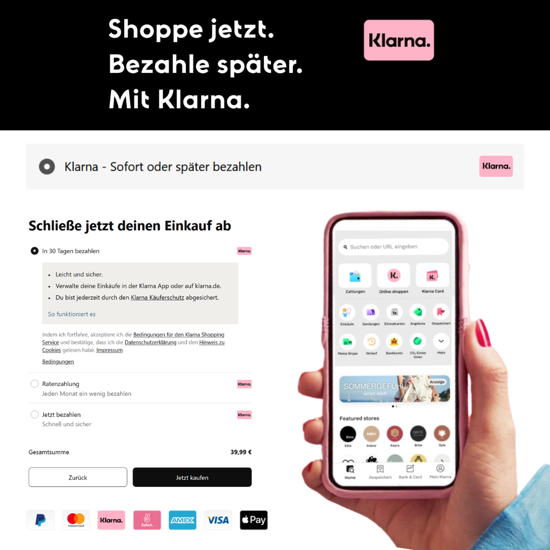 Als Partner von Klarna ermöglichen wir dir eine schnelle und unkomplizierte Kaufabwicklung mit der du sorgenlos bei uns shoppen kannst.